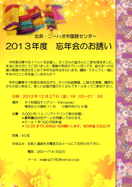 2013年12月27日、総勢38名の皆さんと、賑rやかに楽しく一年を締めくくりました。本当に、たくさんの皆さんのご参加ありがとうございました。