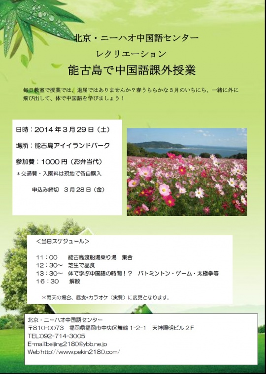 毎日教室で授業では、退屈ではありませんか?春うららかな3月のいちにち、一緒に外に飛び出して、体で中国語を学びましょう!