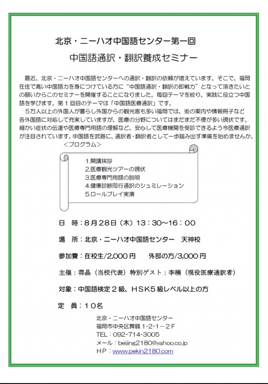 最近、北京・ニーハオ中国語センターへの通訳・翻訳の依頼が増えています。そこで、福岡在住で高い中国語力を身につけている方に“中国語通訳・翻訳の即戦力”となって頂きたいとの願いからこのセミナーを開催することになりました。毎回テーマを絞り、実践に役立つ中国語を学びます。第1回目のテーマは「中国語医療通訳」です。