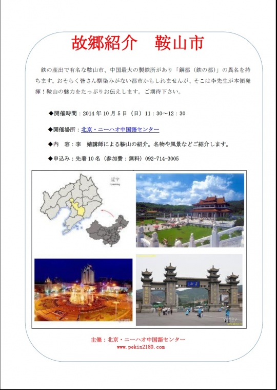 ◆内 容:李 婧講師による鞍山の紹介。名物や風景などご紹介します。