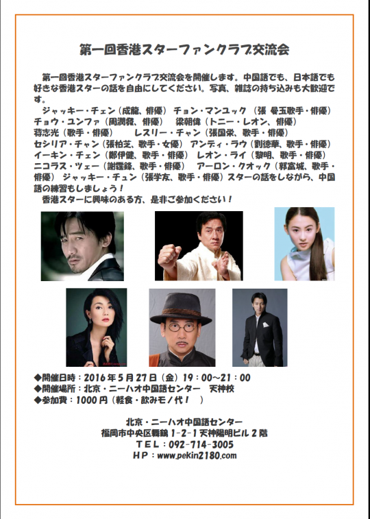 終了! 香港スターファンクラブ交流会 第一回香港スターファンクラブ交流会を開催します。中国語でも、日本語でも好きな香港スターの話を自由にしてください。写真、雑誌の持ち込みも大歓迎です。 ジャッキー・チェン(成龍、俳優) チョン・マンユック (張 曼玉歌手・俳優) イーキン・チェン(鄭伊健、歌手・俳優) レオン・ライ(黎明、歌手・俳優) ニコラス・ツェー(謝霆鋒、歌手・俳優) アーロン・クオック(郭富城、歌手・俳優) ジャッキー・チュン(張学友、歌手・俳優)スターの話をしながら、中国語の練習もしましょう! 香港スターに興味のある方、是非ご参加ください! ◆開催日時:2016年5月27日(金)19:00~21:00 ◆開催場所:北京・ニーハオ中国語センター 天神校 ◆参加費:1000円(軽食・飲みモノ代! )
