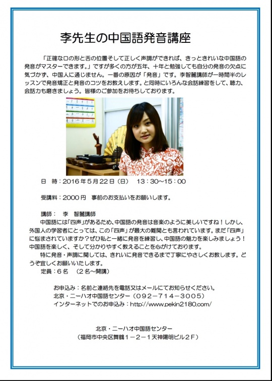 「正確な口の形と舌の位置そして正しく声調ができれば、きっときれいな中国語の発音がマスターできます。」ですが多くの方が五年、十年と勉強しても自分の発音の欠点に気づかず、中国人に通じません。一番の原因が「発音」です。李智麗講師が一時間半のレッスンで発音矯正と発音のコツをお教えします。と同時にいろんな会話練習をして、聴力、会話力も磨きましょう。皆様のご参加をお待ちしております。