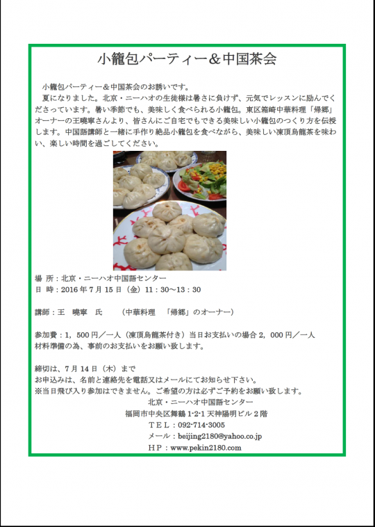 夏になりました。北京・ニーハオの生徒様は暑さに負けず、元気でレッスンに励んでくださっています。暑い季節でも、美味しく食べられる小籠包。東区箱崎中華料理「帰郷」オーナーの王曉寧さんより、皆さんにご自宅でもできる美味しい小籠包のつくり方を伝授します。中国語講師と一緒に手作り絶品小籠包を食べながら、美味しい凍頂烏龍茶を味わい、楽しい時間を過ごしてください。
