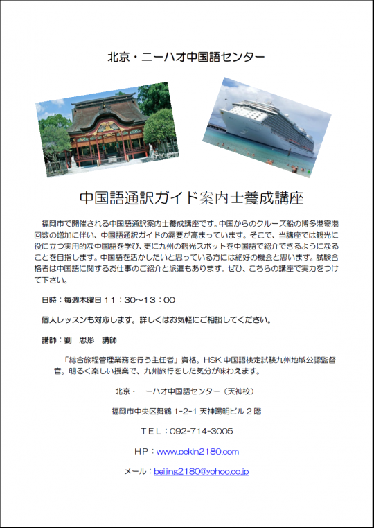 福岡市で開催される中国語通訳案内士養成講座です。中国からのクルーズ船の博多港寄港回数の増加に伴い、中国語通訳ガイドの需要が高まっています。そこで、当講座では観光に役に立つ実用的な中国語を学び、更に九州の観光スポットを中国語で紹介できるようになることを目指します。中国語を活かしたいと思っている方には絶好の機会と思います。試験合格者は中国語に関するお仕事のご紹介と派遣もあります。ぜひ、こちらの講座で実力をつけて下さい。