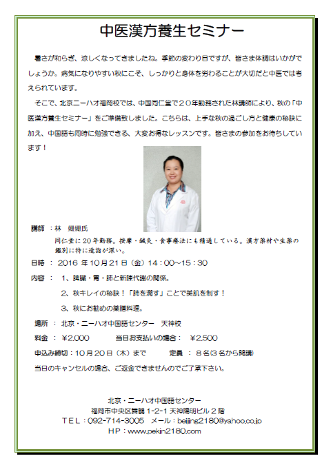そこで、北京ニーハオ福岡校では、中国同仁堂で20年勤務された林講師により、秋の「中医漢方養生セミナー」をご準備致しました。こちらは、上手な秋の過ごし方と健康の秘訣に加え、中国語も同時に勉強できる、大変お得なレッスンです。皆さまの参加をお待ちしています!