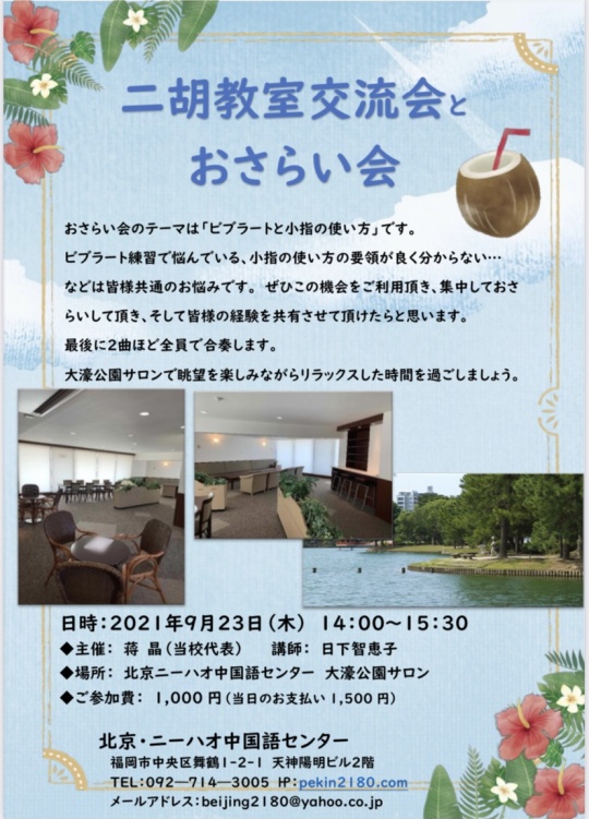 また、皆様に更に「二胡」を深めていただきたく来月は「二胡教室交流会とおさらい会」を企画致しました。こちらの会ではビブラートと小指の使い方を中心に進め、最後に全員での合奏も行います。交流会も行いますので、非常に楽しい雰囲気の中で二胡を楽しんでいただけると思います。
