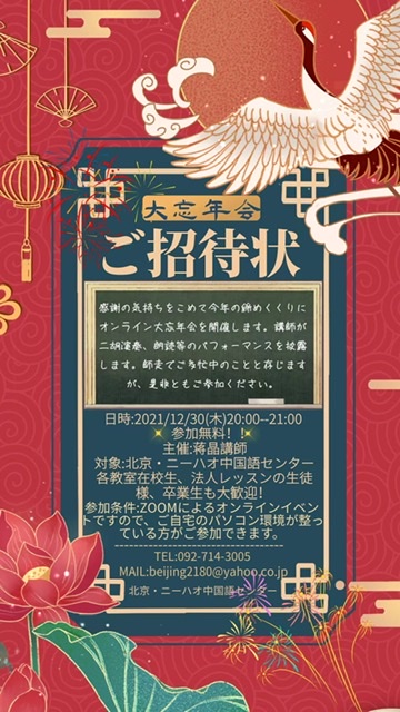 感謝の気持ちをこめて今年の締めくくりにオンライン大忘年会を開催します。当校講師が二胡演奏、朗読等のパフォーマンスを披露します。師走でご多忙中のことと存じますが、是非ともご参加ください。