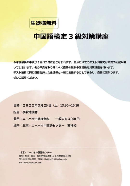 福岡市の北京・ニーハオ中国語センター福岡校のお知らせ
