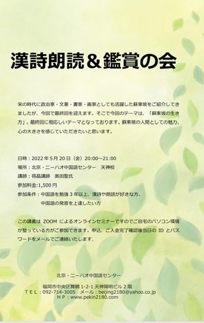 参加条件:中国語を勉強3年以上、漢詩や朗読が好きな方、