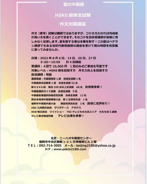 作文(書写)試験は難関ではありますが、コツさえわかれば完成度が高い文を書くことができます。そのコツを当校蒋講師が皆様に惜しみなく伝授します。夏を制する者は本番を制す!この夏はベテラン講師でもある当校代表蒋講師の講座を受けて朝の時間を有意義に使ってみませんか。