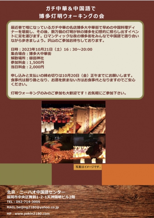 最近巷で噂になっているガチ中華の名店博多大中華街で早めの中国料理ディナーを堪能し、その後、数万個の灯明が秋の博多を幻想的に照らし出すイベントに足を運びます。ロマンティックな夜の博多街をみんなで中国語で語り合いながら歩きましょう。沢山のご参加お待ちしております。