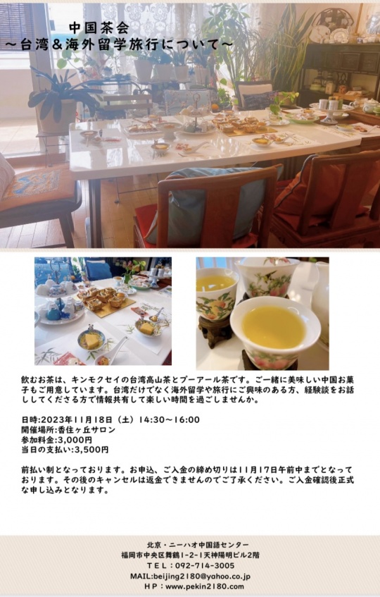 飲むお茶は、キンモクセイの台湾高山茶とプーアール茶です。ご一緒に美味しい中国お菓子もご用意しています。台湾だけでなく海外留学や旅行にご興味のある方、経験談をお話ししてくださる方で情報共有して楽しい時間を過ごしませんか。