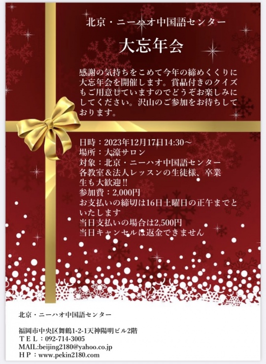 感謝の気持ちをこめて今年の締めくくりに大忘年会を開催します。二胡、フルートの演奏、漢詩朗読劇と賞品付きのクイズもご用意していますのでどうぞお楽しみにしてください。沢山のご参加をお待ちしております。