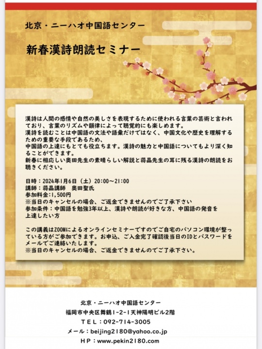 福岡市の北京・ニーハオ中国語センター福岡校のお知らせ