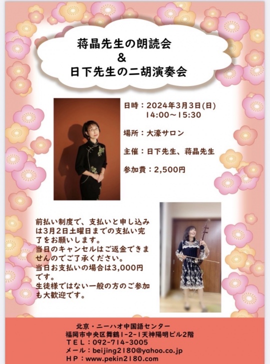 終了 蒋晶先生の朗読会&日下先生の二胡演奏会