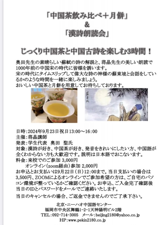 対象:漢詩が好き、中国茶が好き、発音をきれいにしたい方、中国語が全くわからない方も大歓迎です。説明は日本語でおこないます。