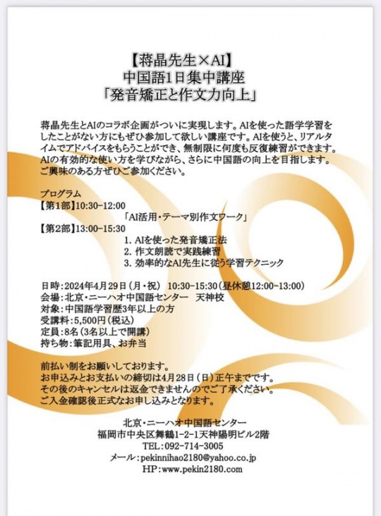 蒋晶先生とAIのコラボ企画がついに実現します。AIを使った語学学習をしたことがない方にもぜひ参加して欲しい講座です。