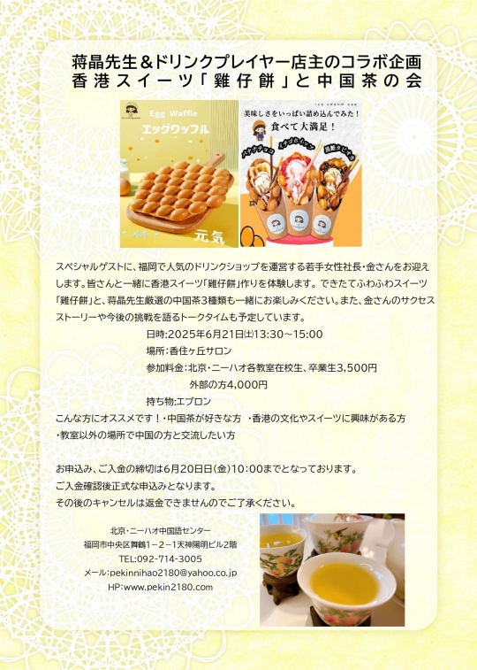 スペシャルゲストに、福岡で人気のドリンクショップを運営する若手女性社長・金さんをお迎えします。皆さんと一緒に香港スイーツ「雞仔餅」作りを体験します。